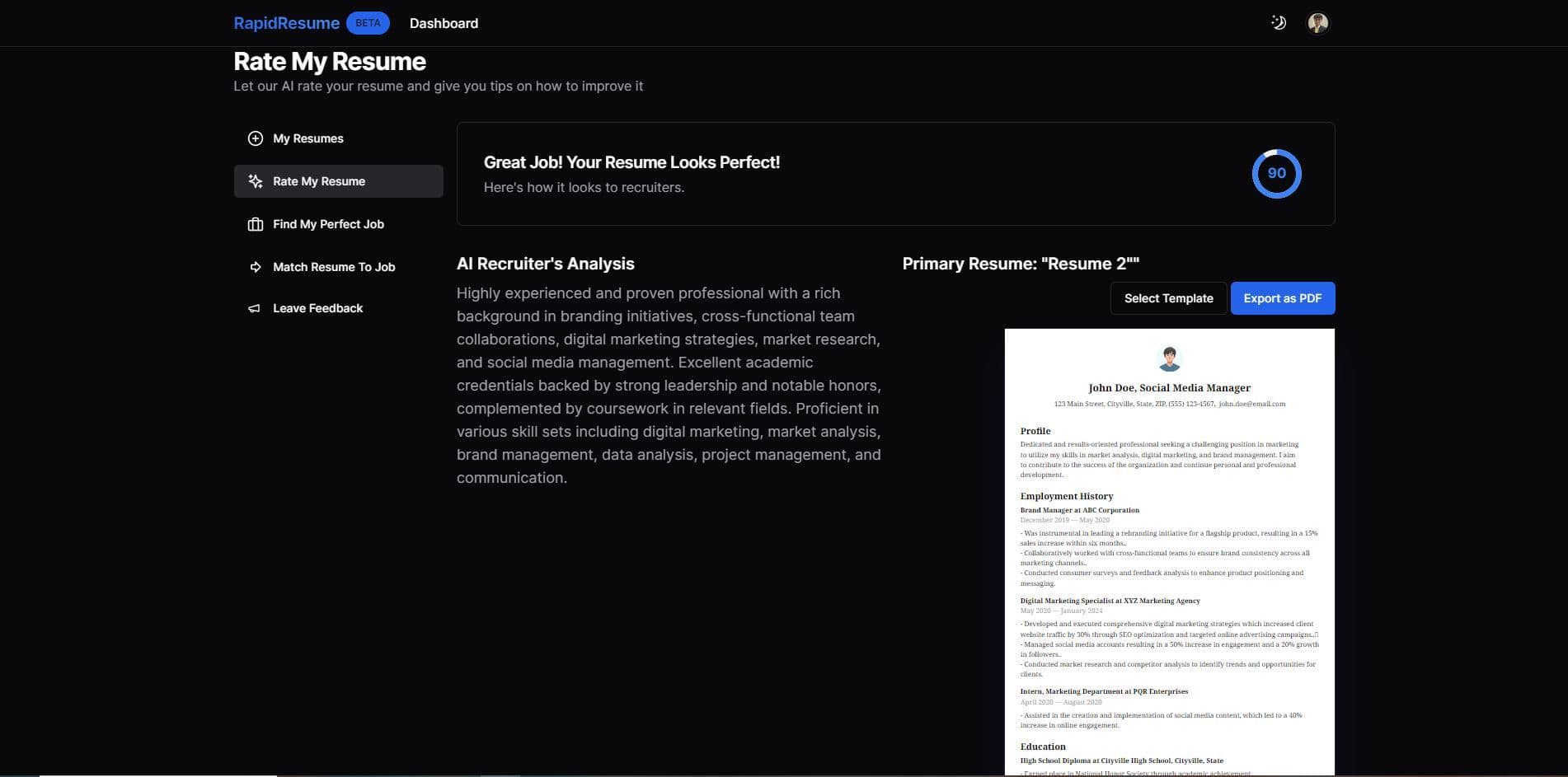 Once you are completely satisfied with the final version of your resume, you can download it in PDF format and send it to potential employers. Additionally, you have the option to use the " Find My Perfect Job" feature, which recommends job opportunities specifically tailored to your primary resume.This innovative tool not only saves you time in your job search but also improves your chances of finding your dream job. With the invaluable assistance of Rapid Resume, you can confidently present your qualifications, experience, and skills, effectively highlighting your unique value.