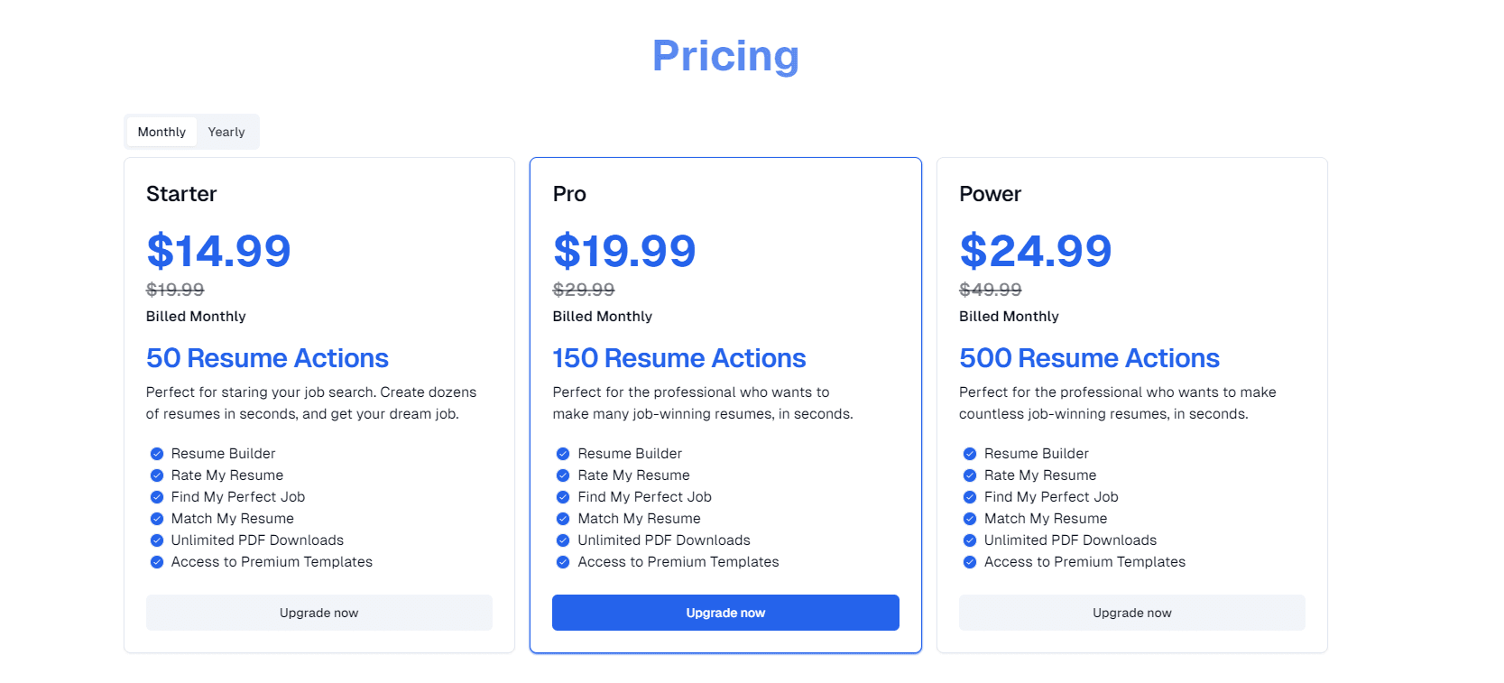 For an excellent starting point to improve your job hunt, start with the starter plan, priced at $4.99 per month. It provides an excellent foundation to enhance your job search despite having some limitations, such as the ability to create only 50 Resume Actions. However, you can still make the most of the platform's features and functionalities.
