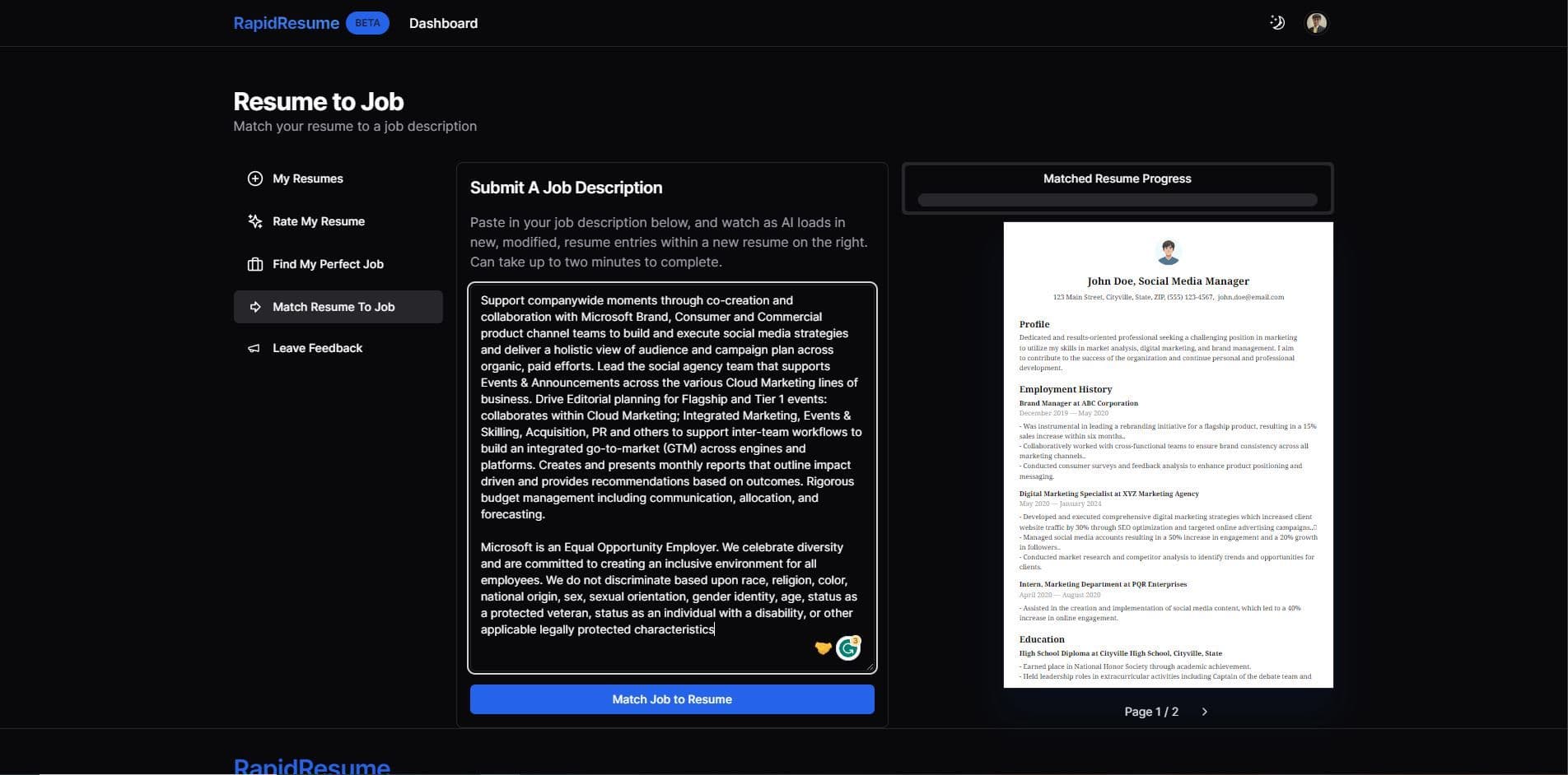 Rapid Resume's AI technology analyzes the job descriptions you provide and matches them with the content of your resume. This feature ensures that your resume is tailored to meet the specific requirements of each job you apply for.