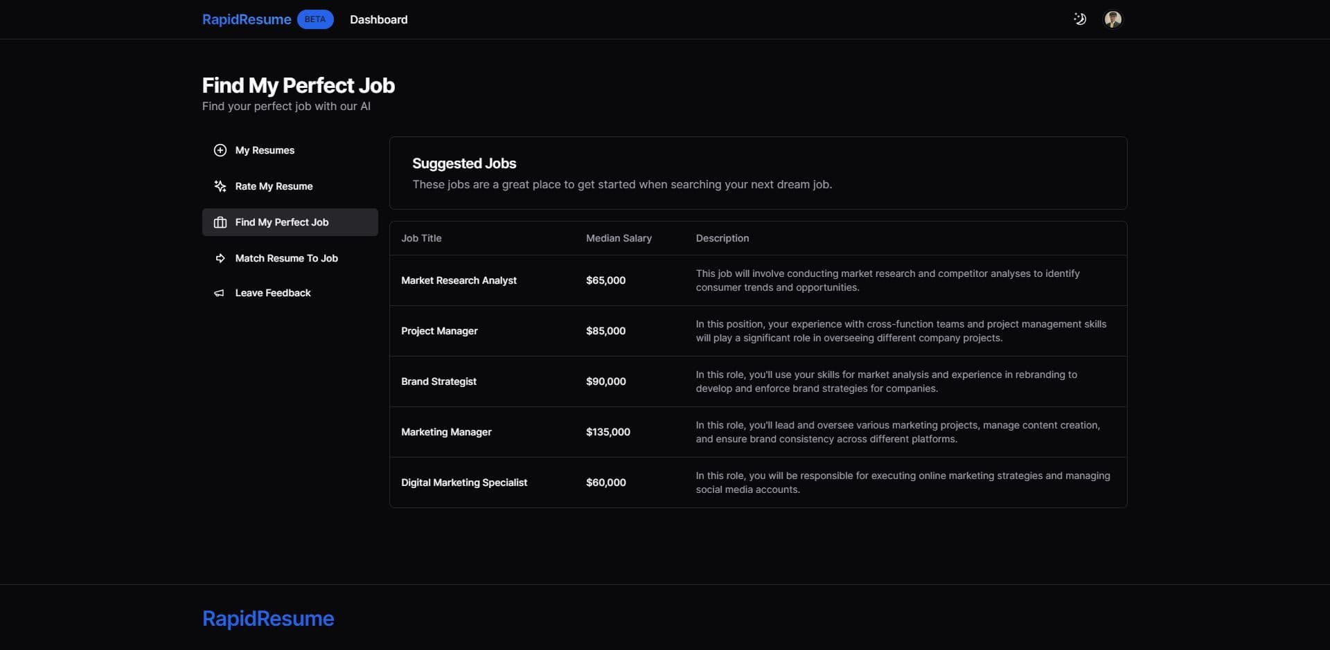 Rapid Resume sets itself apart from the competition through various distinctive aspects. In addition to offering a clear price advantage, our platform places a strong emphasis on leveraging AI technology to thoroughly analyze resumes and optimize them to their fullest potential.Moreover, we offer unique features that truly distinguish us from our competitors, including the innovative "Find My Perfect Job" tool. Furthermore, our AI-powered resume builder is unrivalled in terms of user-friendliness and speed, guaranteeing the creation of a polished and professional resume in less than a minute.