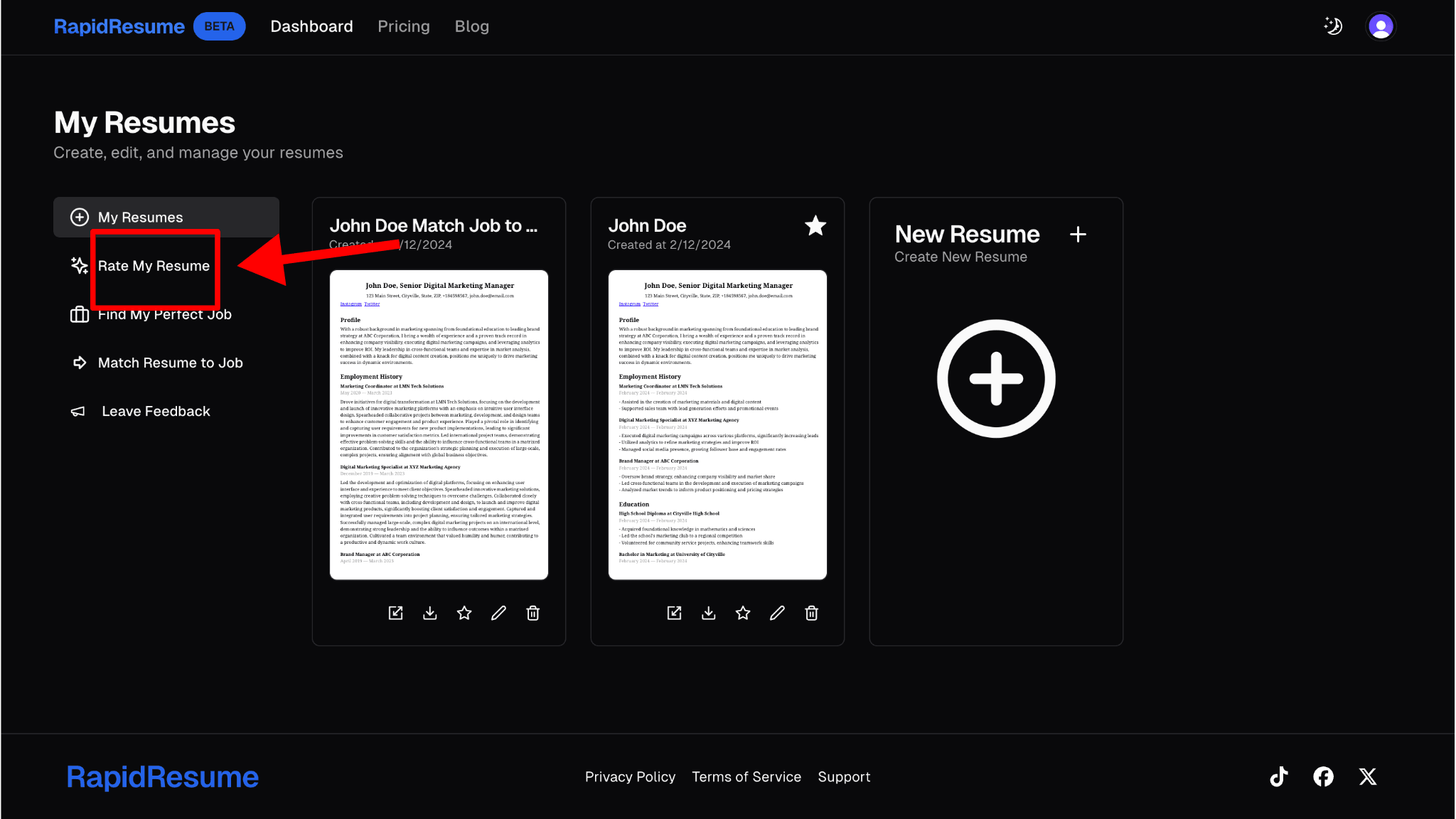 Once you are in the Rapid Resume dashboard, find the "Rate My Resume" button on the left side of your screen under "My Resumes." Click on it.