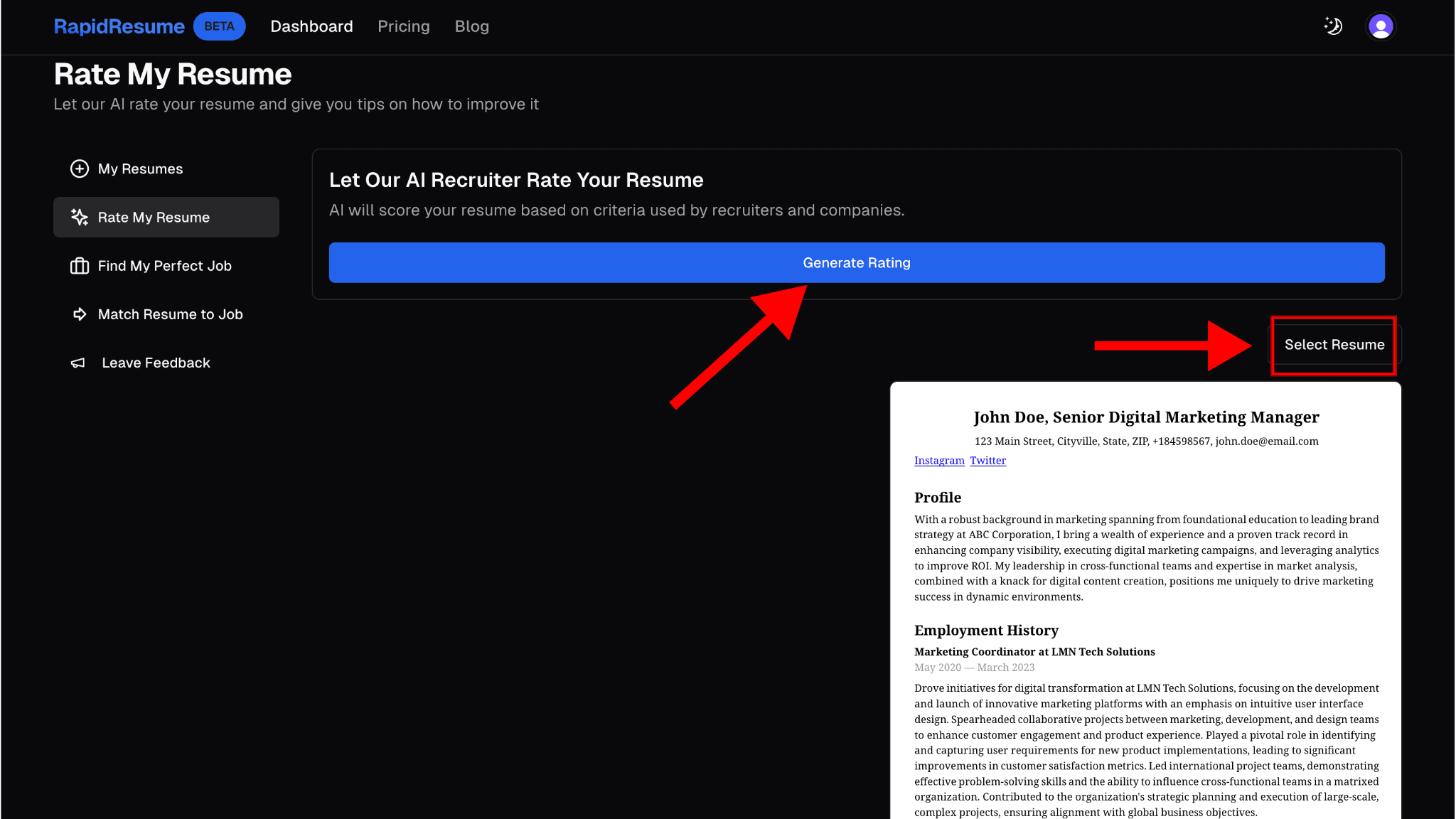 Step 2: Generate Rating or Select Your Resume