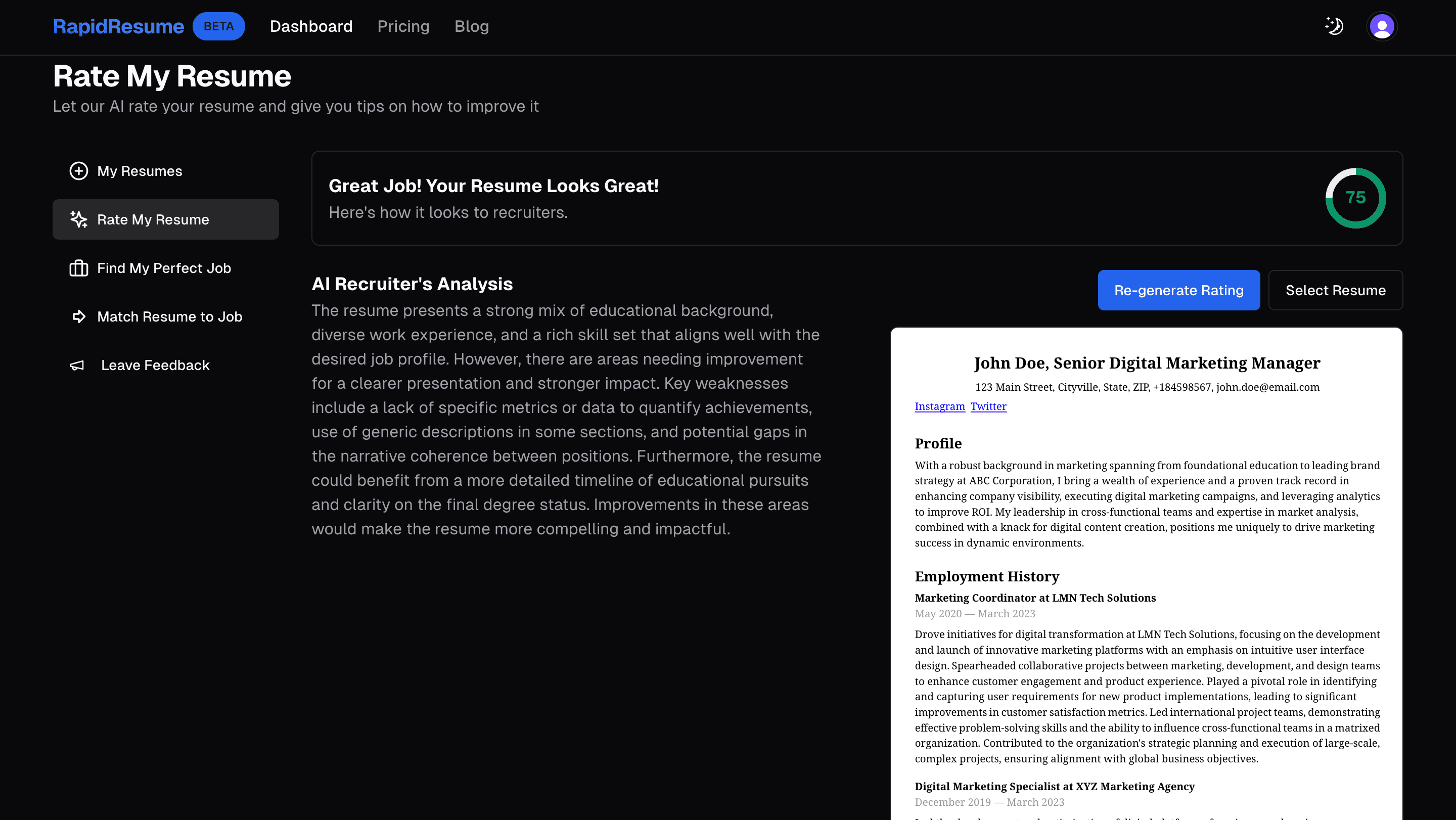 Rate My Resume is one of many features that we have for Rapid Resume. It allows you to see the perspective of recruiters looking at your resume. It also gives you a rating system and feedback to improve your resume so you can stand out more.If you want to learn more about how Rate My Resume works or different features Rapid Resume has click here.