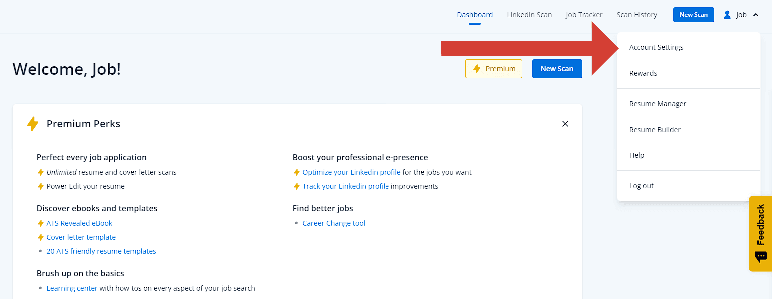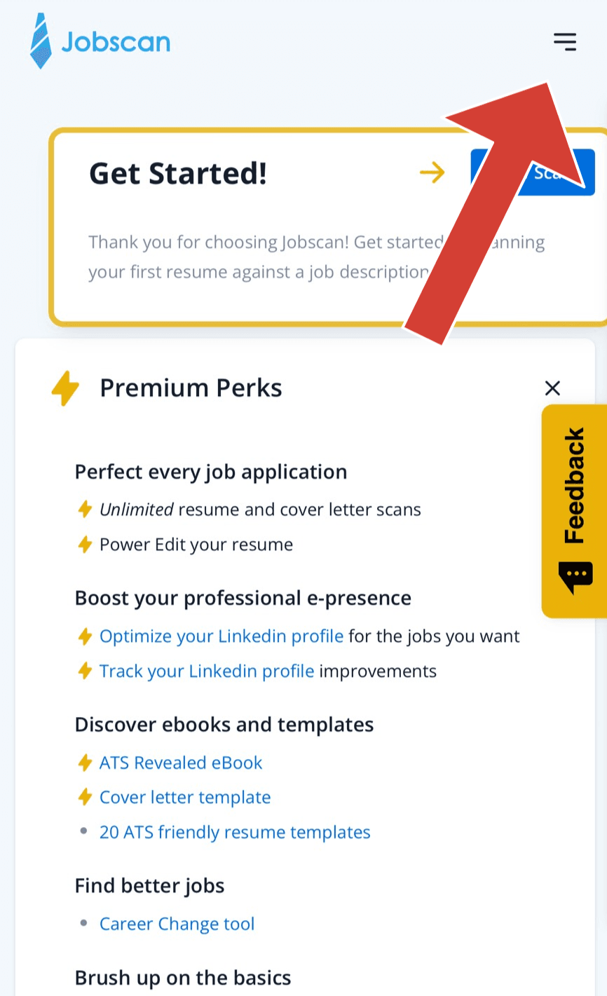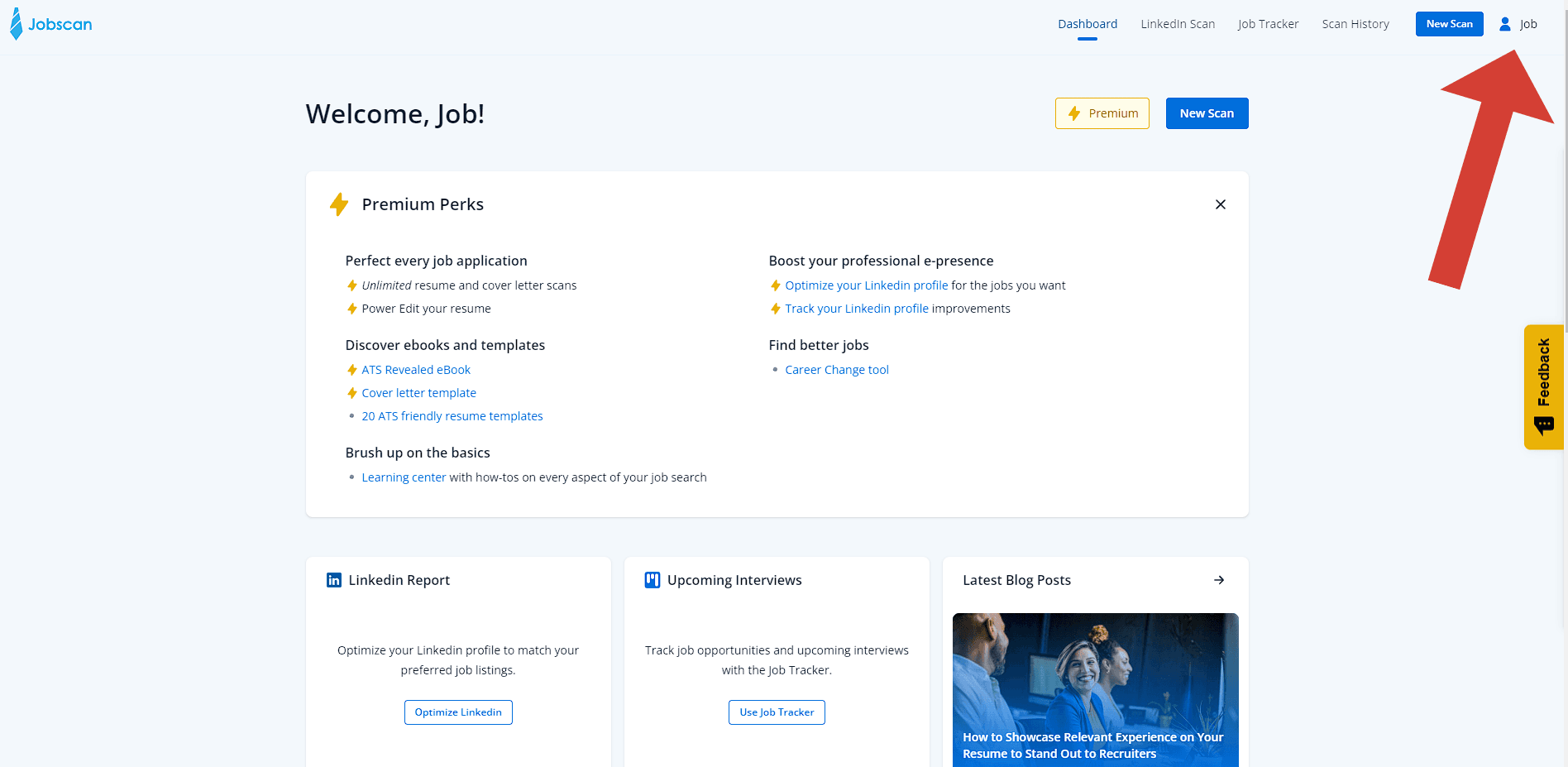 First, ensure that you're logged in. Check the right corner of the Jobscan interface. You can see a profile picture on the website. Click on it.