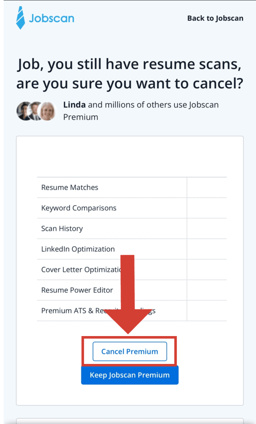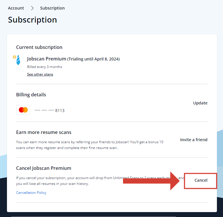 At the “Subscription” interface. Look at the words "Cancel Jobscan Premium" and click "Cancel" on the right corner of the screen.