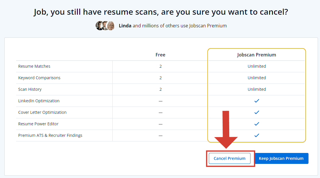 On the Subscription page, next to "Cancel Jobscan Premium", you will see the "Cancel" button. Click on it.