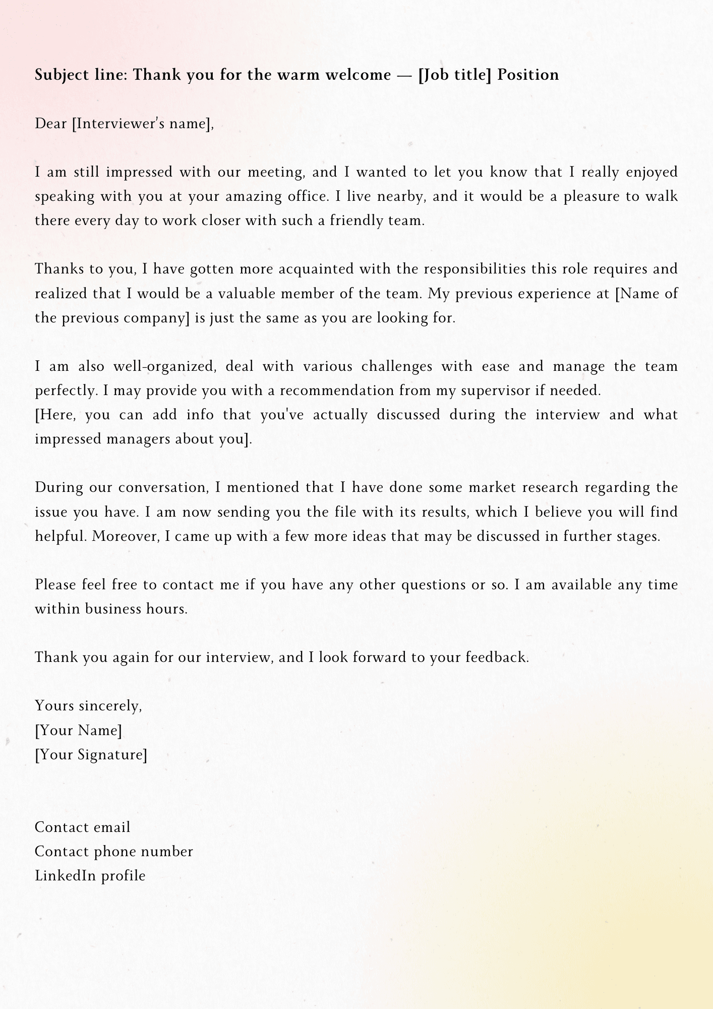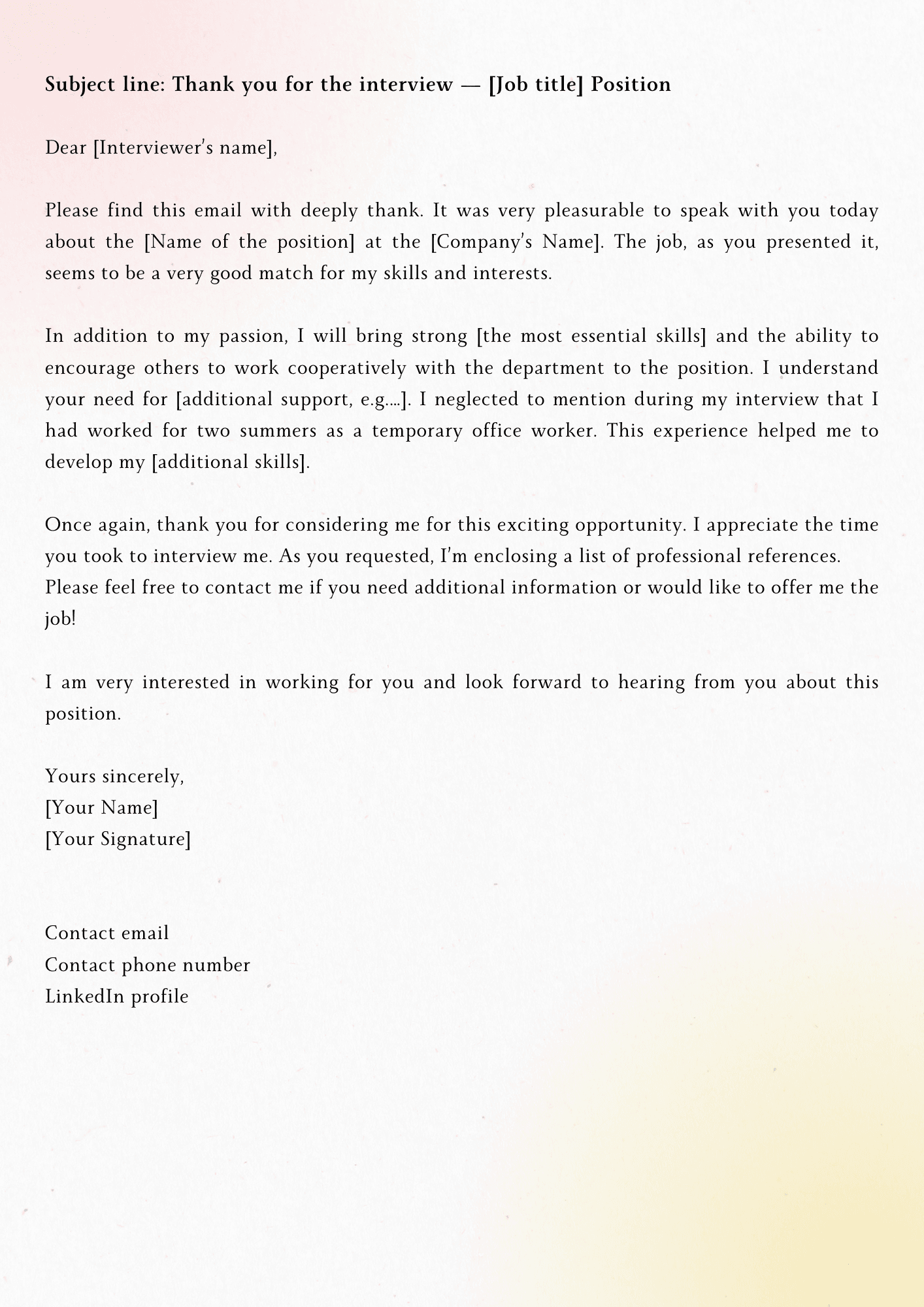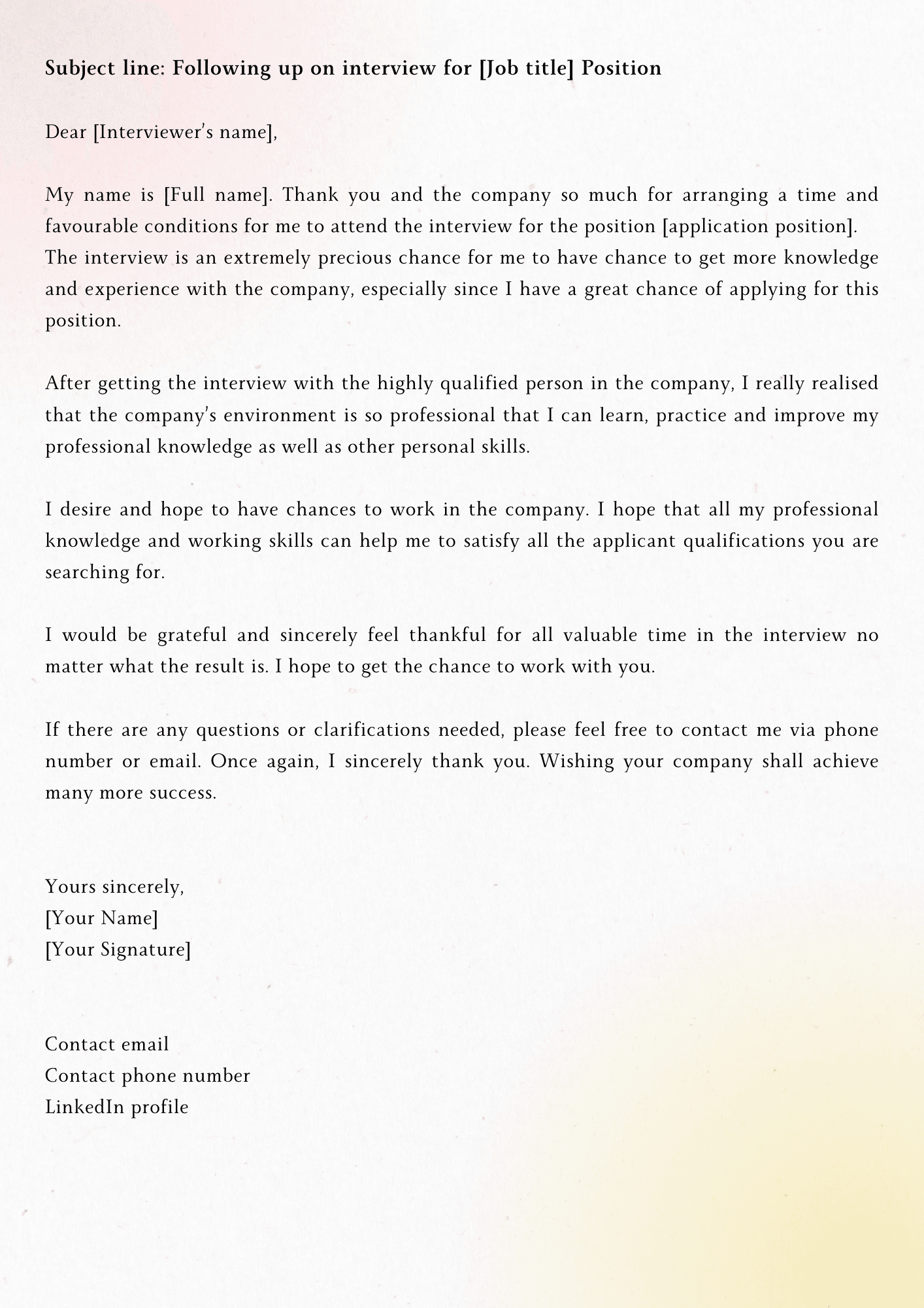At the end of the letter, you can express your desire to work at the company as well as ask suggestive questions to see if the employer needs you to provide any additional information after the interview. At the same time, remind them that you are eagerly awaiting the result of the interview from the company and look forward to hearing a response soon. Please note that, once again, don't hesitate to thank the employer for the valuable time the employer spent interviewing and reading your thank you letter. Kindness and politeness will help you gain professional attitude points in the eyes of the employer.The right email signoff should end your email in a positive and professional way. Make sure that it matches your tone and the company's culture as well. Here are some signoff options for you to refer to:- Yours Sincerely